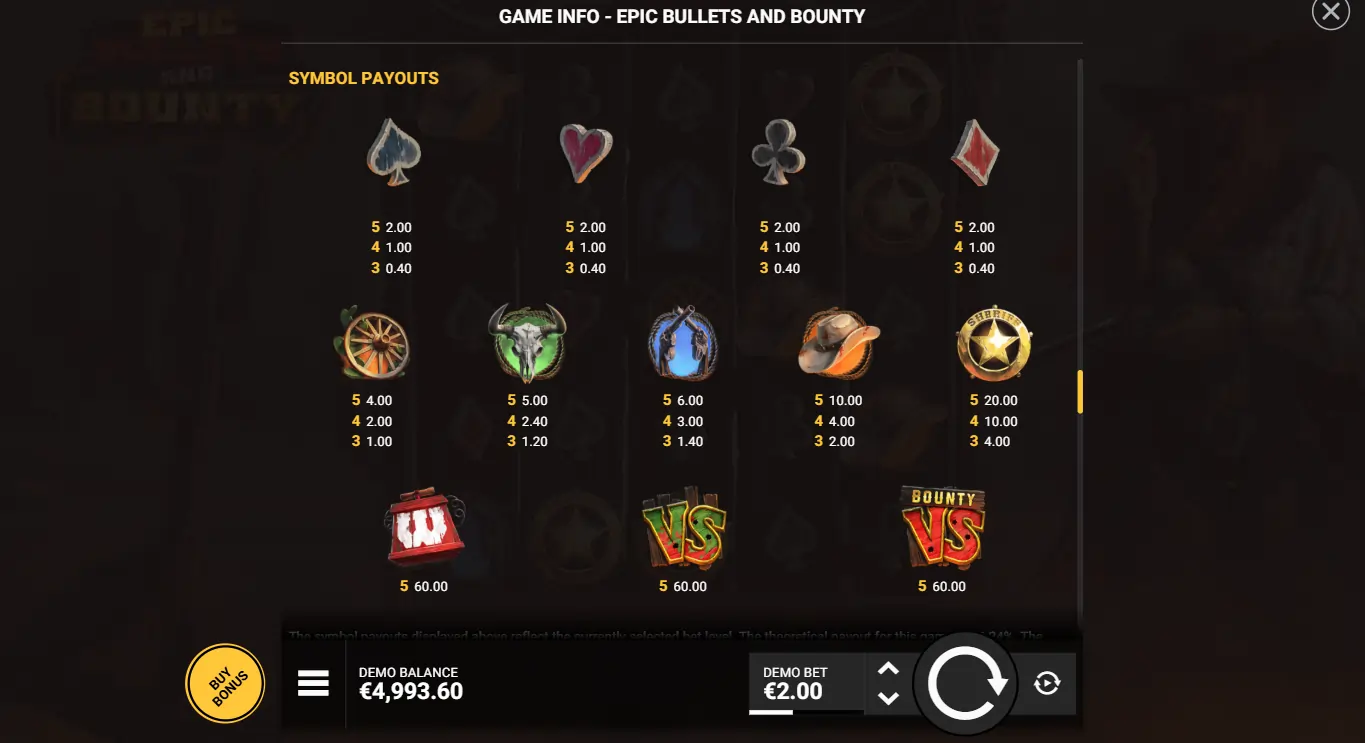 The big yellow button called Buy Bonus lets you pay to activate the special features on Epic Bullets Bounty. The prices start at 5x the bet and go up to steep 1,000x the bet. We’ve listed the prices for each option only, since we’ve already explained the special features on the slot.