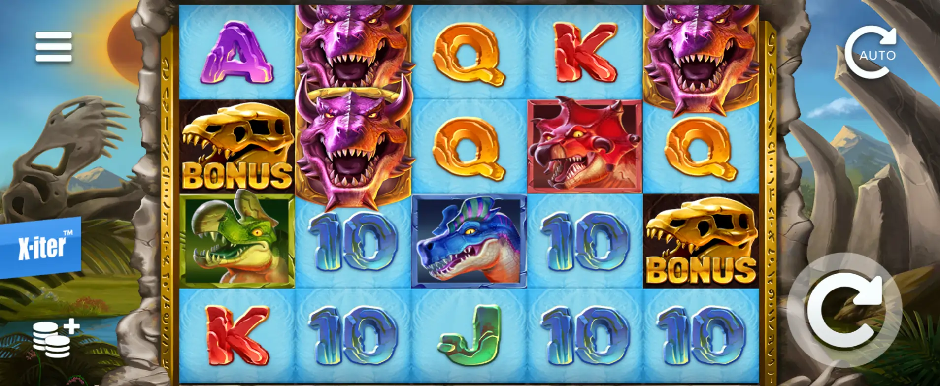 The icon with coins is where you choose one of the preset bet sizes, and the X-iter button is for using the X-iter options. The hamburger menu takes you to the paytable and rules, while the ‘Auto’ button is for activating autoplay.
