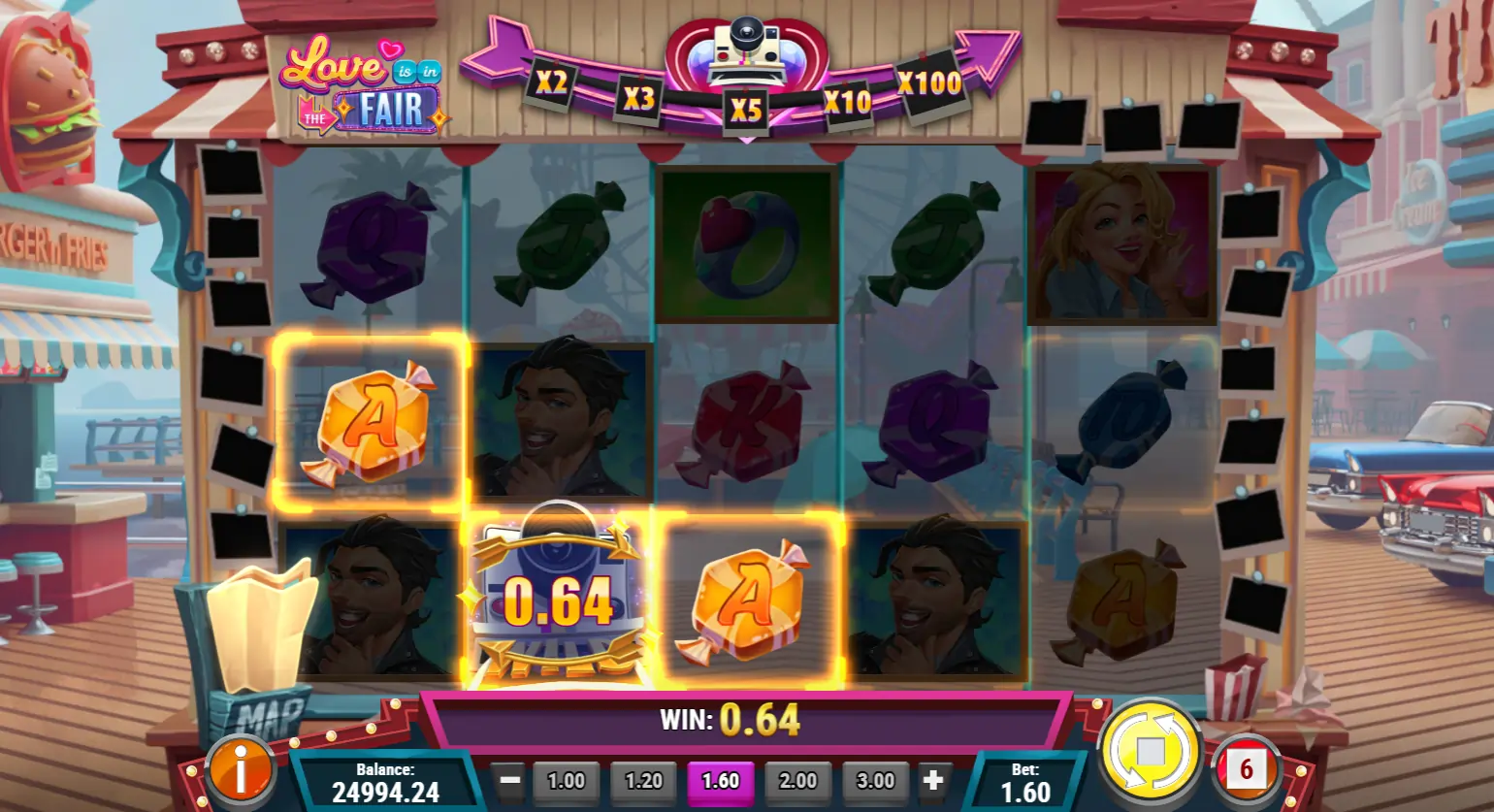 You’re in for a date by the sea, where you can win prizes, capture moments, and ride the Ferris wheel. As you spin the 5×3 reels, you’ll collect romantic pictures on the “Love Map,” unlocking multipliers up to 100x.